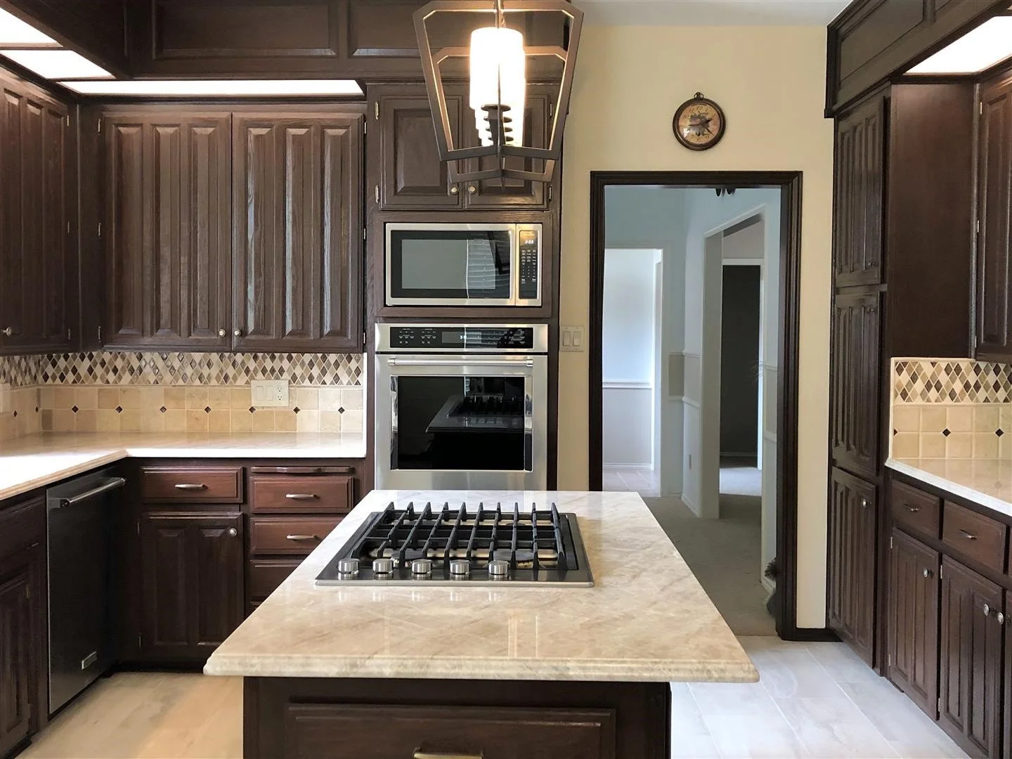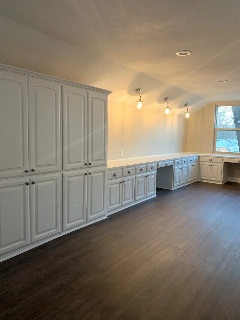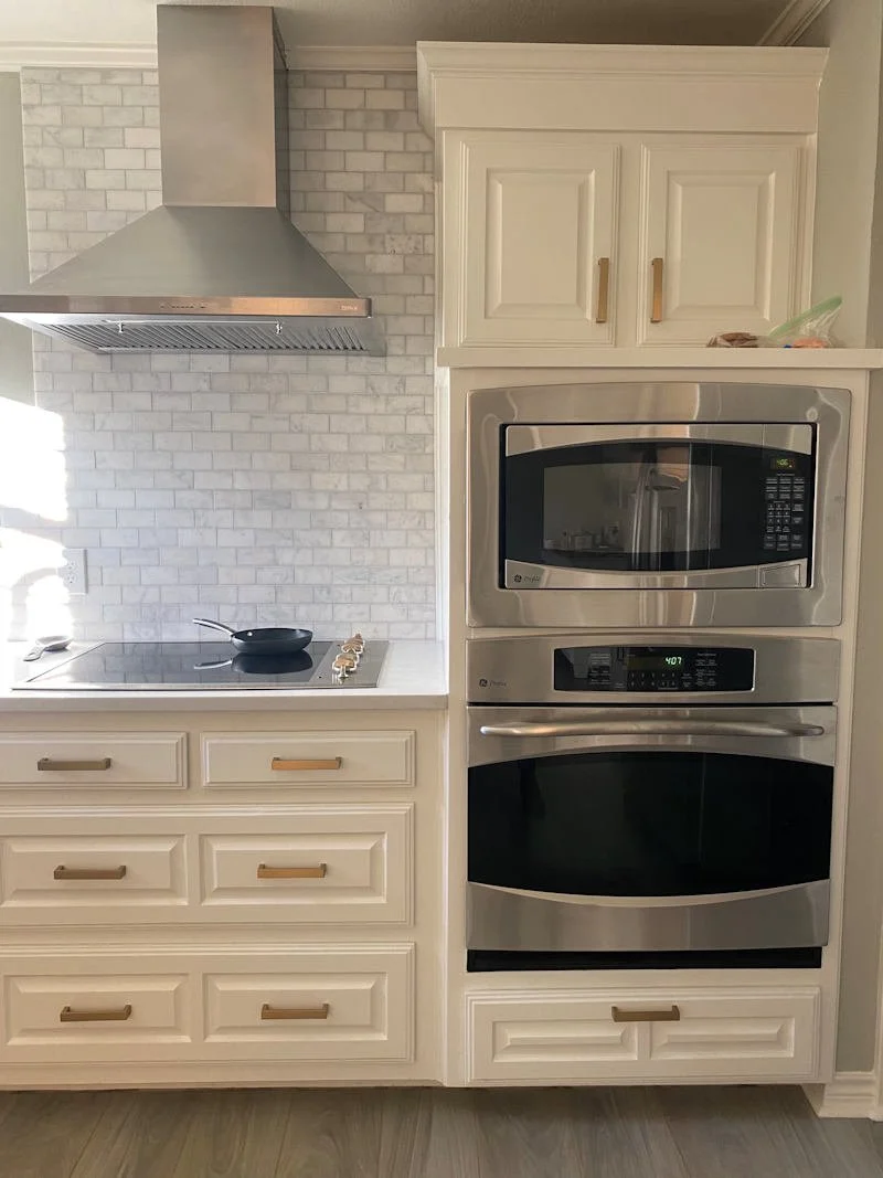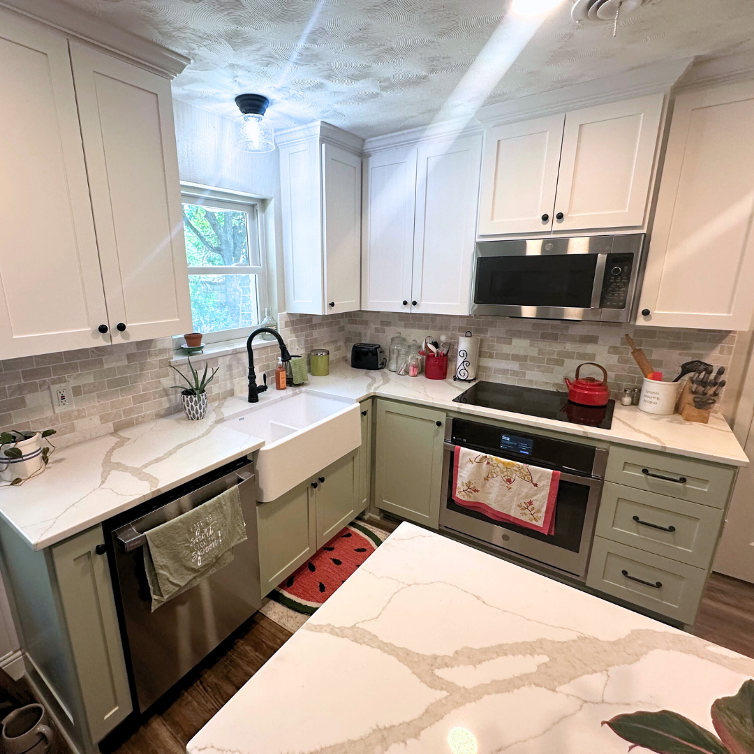 Modern kitchen renovation with quartz countertops, stainless steel appliances, and white cabinets